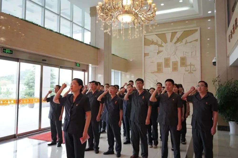 “我志愿加入中国共产党,拥护党的纲领,遵守党的章程,履行党员义务,执行党的决定......”在党组书记、院长秦昆的领誓下,全体党员高举右拳,面对鲜红党旗,庄严宣誓。在铿锵誓言中,全体干警初心再次受到洗礼,理想信念更加坚定。