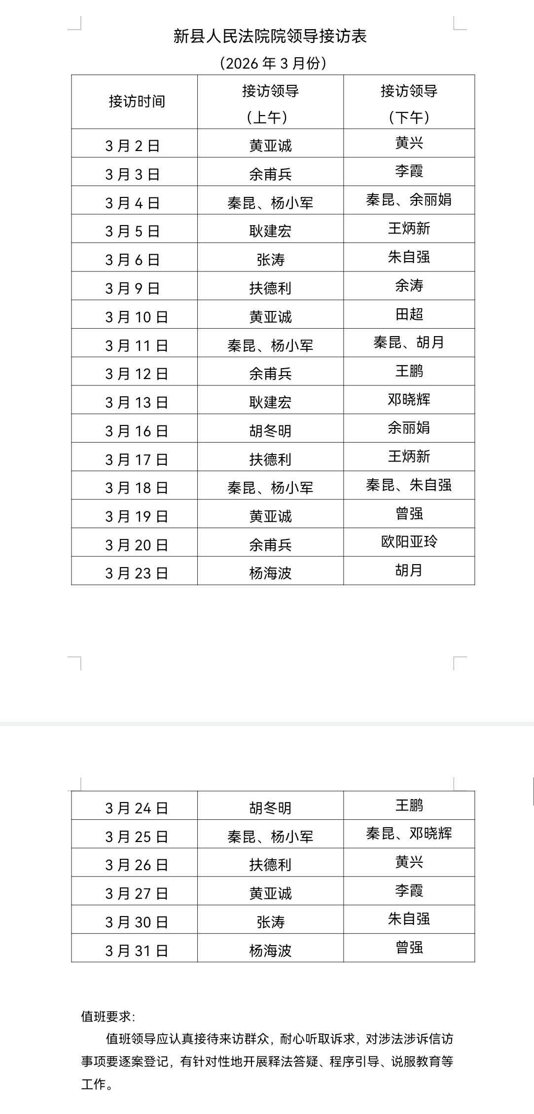 新县人民法院2026年3月份院领导信访接待值班表
